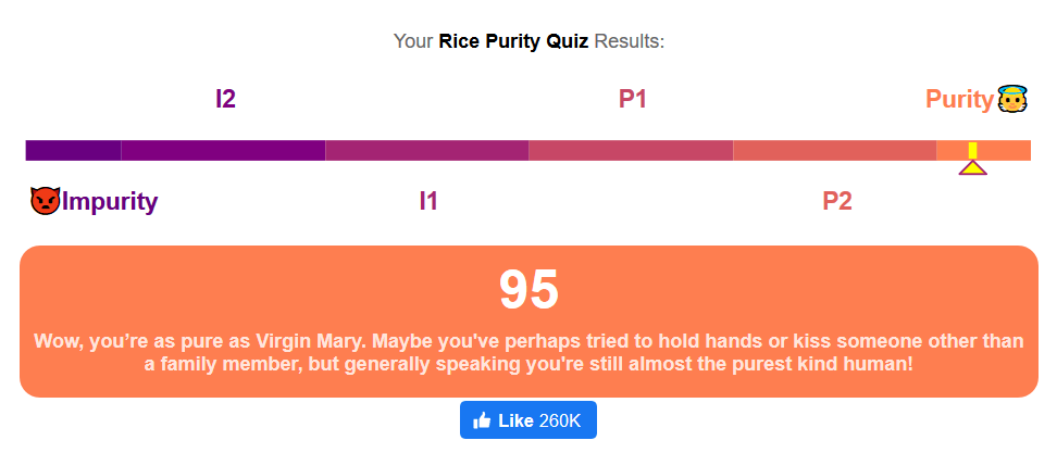 The test comprises of 100 questions that covers aspects such as what does the score you get on the rice purity test mean?